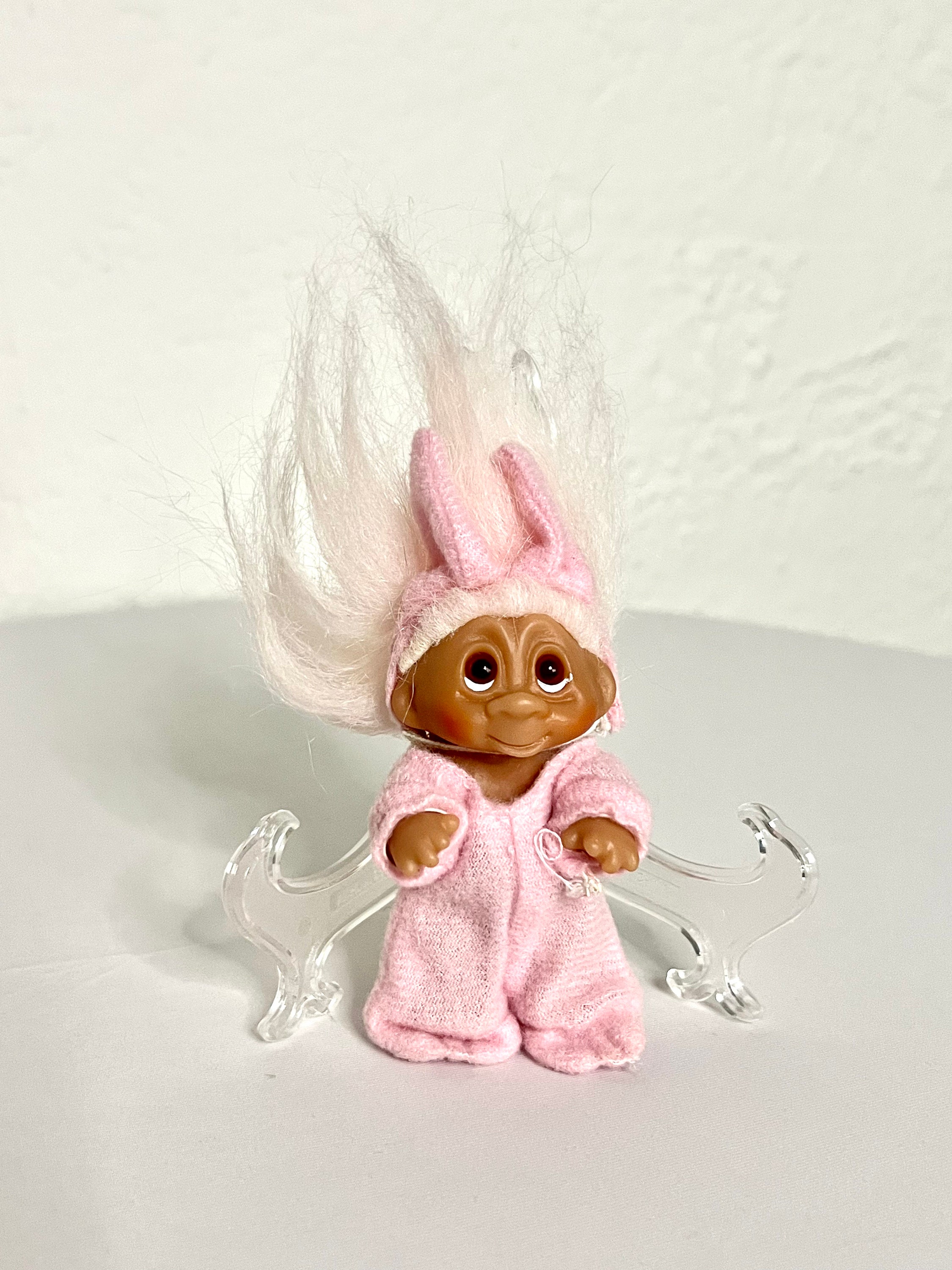 One of the rarest types of troll dolls has white hair and pink eyes.